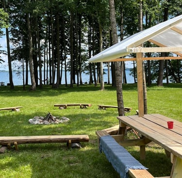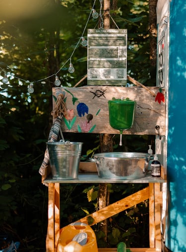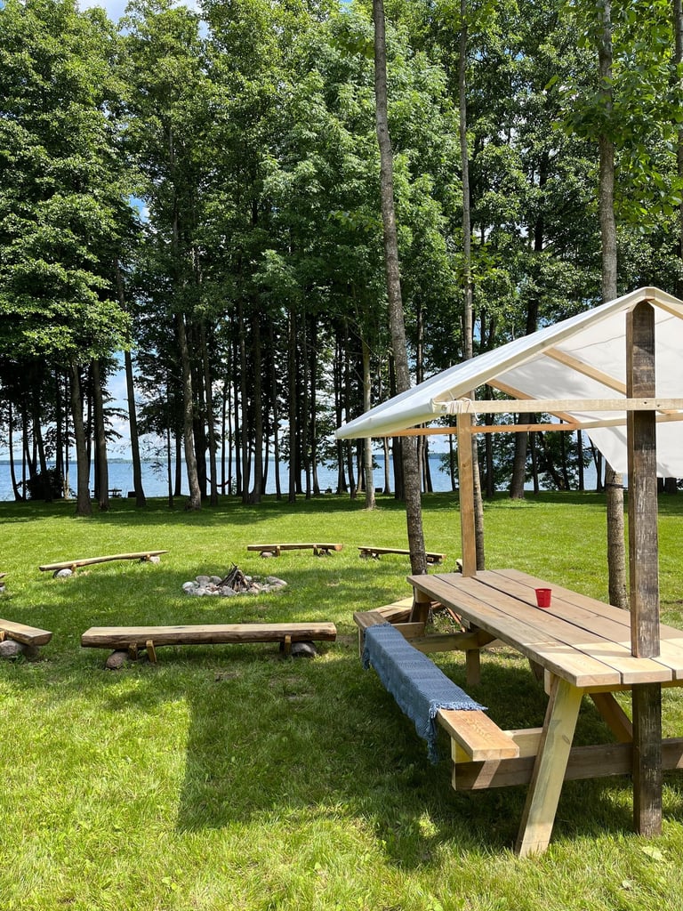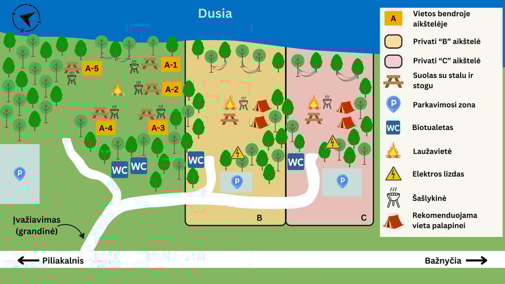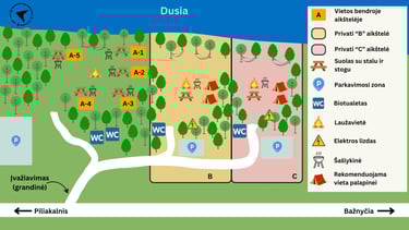 Mūsų stovyklavietėje galite mėgautis tiek privačiomis, tiek bendromis poilsio erdvėmis. Siūlome dvi privačias aikšteles su elektros tiekimu, suteikiančias daugiau privatumo ir patogumo. Taip pat turime bendrą aikštelę su penkiomis rezervuojamomis vietomis be elektros. Kiekvienoje apsistojimo vietoje įrengti suolai su stalu ir stogeliu, o šalia – šašlykinės, kurias rasite tiek privačioje, tiek bendroje aikštelėje. Bendrojoje aikštelėje įrengti du bio-tualetai, o privačiose zonose – po vieną. Išskirtinė stovyklavietės išdėstymo struktūra leidžia pasirinkti tiek saulėtą, tiek pavėsingą vietą.